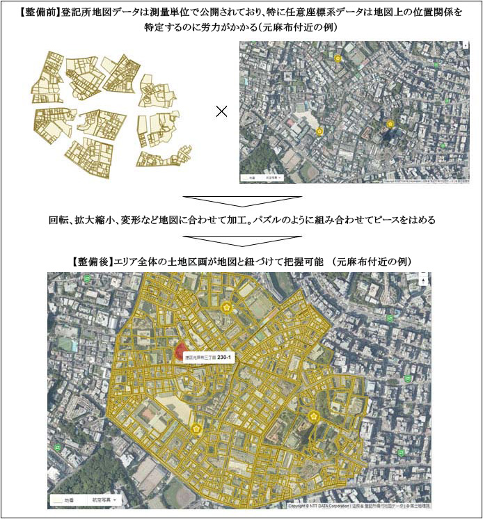 登記所地図データを加工し、地図に重ね合わせて全国網羅的に配信