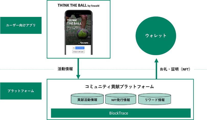 ブロックチェーンなどのWeb3技術を活用し、ファン・サポーターが、気候変動問題の解決につながる行動によって獲得したクラブからのお礼や活動証明を、NFTとして発行できるプラットフォームをトライアル参加者に提供します。基盤の一部にNTTデータの「BlockTrace®」注1、※3の技術を活用しています。