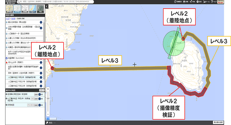 - 1. 本件では、VTOL型の固定翼UAV(以下:ドローン)を使用し、事前に設定した飛行ルート設定に従って自律飛行させ、大島を周回しながら海岸を撮影する事で、被災状況を迅速に確認することについての有効性を検証しました。