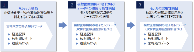 今回の研究では、宮崎大学の電子カルテデータをベースに、大規模言語モデルBERT注1を用いてモデルを構築したうえで、6つの医療機関の電子カルテデータへの適用可能性と実用性を検証しました。その結果、複数医療機関の電子カルテデータに適用可能であることや、本モデルで抽出した薬物治療効果から算出した臨床研究の評価項目は、人が抽出した結果と同様の傾向を示すことを確認しました。