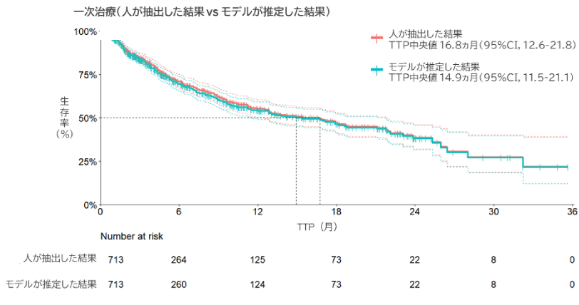 - モデルで推定した薬物治療効果と薬物処方等の構造化データを組み合わせて、TTPを治療ラインごとに推定した。人が抽出した結果とモデルが推定した結果を比較評価したところ、同様の傾向を示した(下図※)。