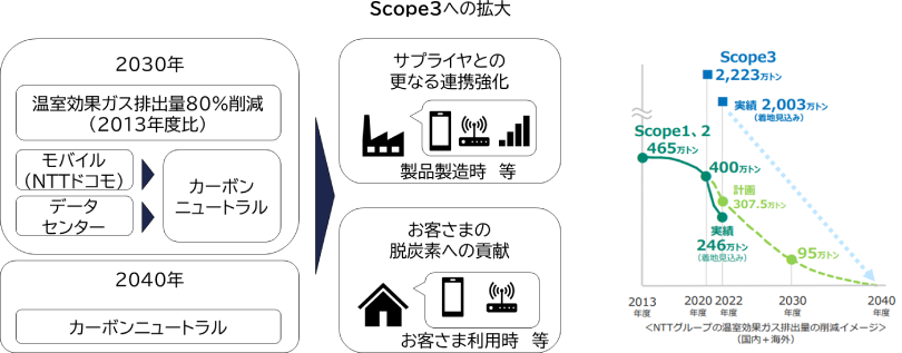 NTTグループにおいても、エネルギービジョン「NTT Green Innovation toward 2040」に基づき、脱炭素化の取り組みを推進しており、2040年度には自社排出量であるScope1,2に加えて、サプライチェーン排出量であるScope3まで含めたカーボンニュートラルの実現を目指しています。