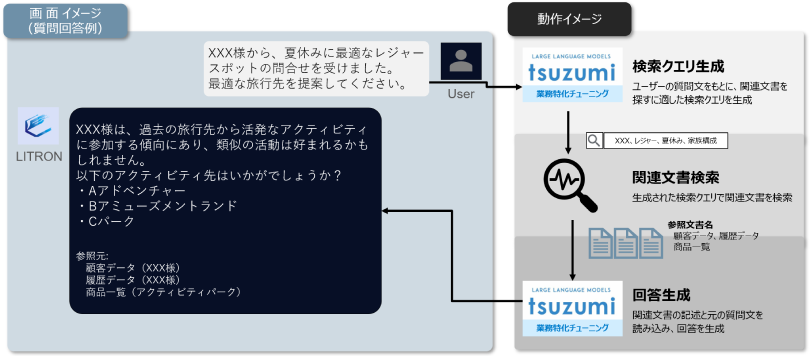 図:LITRON Generative Assistant動作イメージ図(例:旅行代理店のユースケース)