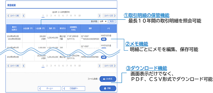 デジタル法人通帳は、最長10年間の取引明細を普段使い慣れたインターネットバンキングの画面で照会ができ、PDF、CSV形式のダウンロードも可能です。また、紙通帳の余白にメモをするイメージで明細ごとにメモを行うことも可能であり、利用企業においては、経理業務にかかる作業時間とそれに伴うコストの削減が見込めます。(1企業1か月あたり1,700円程度削減注2)
