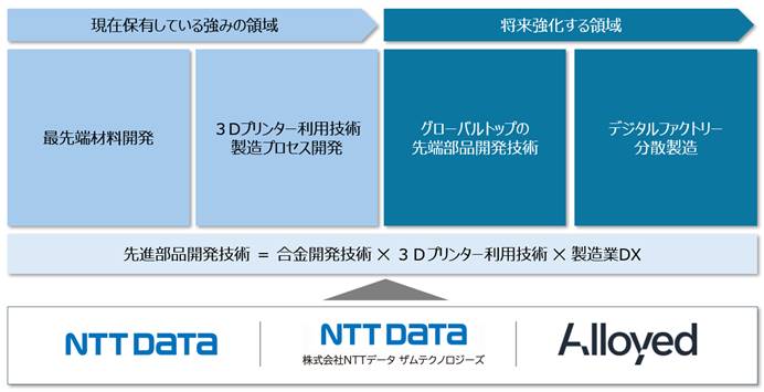 NTTデータ ザムテクノロジーズは、3Dプリンターの輸入販売・保守サービスを行うとともに、航空宇宙、産業機械、モータースポーツなどの分野向けに3Dプリンターを用いた先端金属部品の開発・製造を行うことで、部品の高機能化、高性能化、開発リードタイム短縮などの価値をお客様に提供しています。NTTデータ ザムテクノロジーズとAlloyed社は、2020年以来、協力関係を構築してまいりましたが、この度、合金開発領域で世界最高水準の技術力と3Dプリンター利用技術を有するAlloyed社との関係を発展させるために、資本業務提携を行うことに合意しました。今回の提携強化により、NTTデータ ザムテクノロジーズは技術力の一層の強化を図り、お客さまの抱える先端技術部品設計・製造の課題へのソリューションを提供し、事業拡大を支援してまいります。