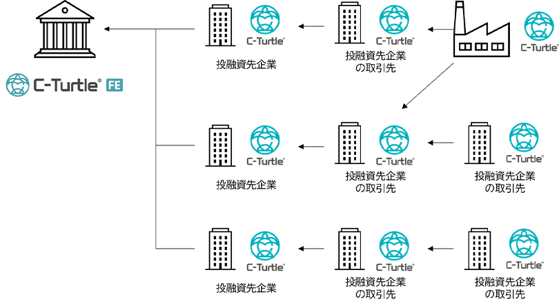 また、投融資先がC-Turtleを活用することで、投融資先やサプライヤーのGHG排出量の可視化状況が明確になり、サプライチェーンを通じたGHG排出量の算定・削減の推進が可能となります。C-Turtle FEはC-Turtleのプラットフォーム上で自動連携できるため、効率的で精度の高い可視化GHG排出量把握を実現します。