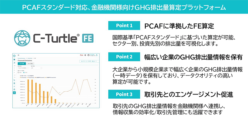 C-Turtleはサプライヤーの削減努力を自社のScope3排出量の削減効果として取り込むことのできる「総排出量配分方式」を採用するGHG可視化プラットフォームです。C-Turtle FEは、C-Turtleのサービスの一つとして、金融機関の国際的な排出算定基準「PCAFスタンダード」に準拠し、投融資先のFEの可視化と削減を支援するサービスです。C-Turtle FEを利用することで、金融機関の投融資先の一次データを活用し、投融資に係るGHG排出量およびその削減努力を反映したデータクオリティーの高いFE算定が可能となります。さらに、最新の規制動向やトレンドに応じたタイムリーな機能追加、係数データ等の提供も行っています。