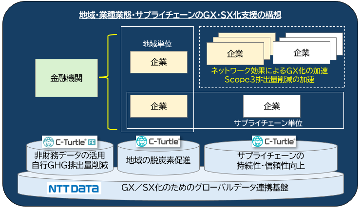 NTTデータは、C-TurtleをコンコルディアFGの投融資先にも提供注2し、FE算定高度化の支援、および投融資先に対するC-Turtleの提供を通じて、エンゲージメントを強化し、サプライチェーン全体や地域経済のカーボンニュートラルの実現を支援します。また、投融資先へのC-Turtle提供については、投融資先の脱炭素のためのアクションや行動変容の促進を目的として、一定の条件のもとで無償提供も実施しています。