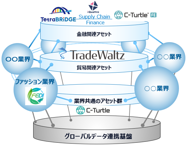 このような課題を踏まえ、NTTデータは業界横断でのソリューションセットの企画開発を「Trusted Supply Chain」のもと進め、DX化の加速とグローバルデータ連携基盤を整備することで、企業サプライチェーンの強靭(きょうじん)化や持続性の向上を目指しています。具体的には、C-Turtle/C-Turtle FEをはじめ、ファッション業界のDX化・可視化を実現し服飾ロス削減等に貢献する「FEDI®エコシステム」、請求書受領から決済までをシームレスにつなげる「TetraBRiDGE®」、商流情報を活用したファイナンスを可能とする「サプライチェーン・ファイナンス」、貿易のDXを実現する「TradeWaltz®」などSX化の加速を支援する新サービスを企画・展開中です。これらのソリューションにより、商流×物流×金流をワンストップでつなげるエコシステムを形成し、お客さまのサステナビリティ向上に貢献することを目指します。