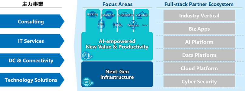 「AI-empowered New Value & Productivity」では、AI技術を活用により新たな価値を創出し、顧客事業の成功や社会の持続的成長に寄与するITサービスを提供するとともに、業務プロセスの再構築による生産性の構造的な変革を行います。また「Next-Gen Infrastructure」では、NTTデータグループのフルスタックな事業ポートフォリオを生かし、AI時代に求められる高機能・高信頼な次世代インフラサービスの提供を推進します。NTTデータグループでは、これら2つの注力領域を推進するにあたって、AI・クラウドベンダー各社とのアライアンスを拡大しており、グローバル規模でのエコシステム構築を進めています。
