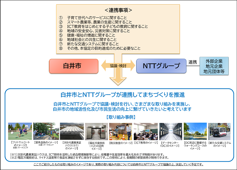 白井市は、第6次総合計画を行政運営の指針とし、人口減少や高齢化を見据えた持続可能で暮らしやすいまちづくりを推進しています。本協定は、NTTグローバルデータセンター・ジャパンによる白井市でのデータセンター開発を契機として、白井市とNTTグループ4社が、「デジタルインフラ」「農業」「まちづくり」を軸に、白井市の地域活性化に向けたさまざまな取り組みを推進することを目的としています。