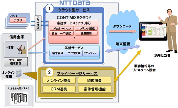 金融機関向け営業支援クラウドサービス「CONTIMIXEクラウド」は、Android端末向けのアプリケーション機能を提供するSaaS型注サービスプラットフォームです。本サービスを導入することにより、金融機関はクラウド上から営業を効率化するために必要なアプリケーションを自由に選択し、ダウンロードすることができます。また、信用金庫向けには2013年度下期に提供開始予定の「プライベート型サービス」で勘定系システムと連携させ顧客情報などを参照可能にすることにより、金融機関の渉外担当者や営業窓口担当者は顧客一人ひとりの要望にあわせて迅速に対応することができ、コミュニケーションを円滑化することで売り上げの拡大を実現します。