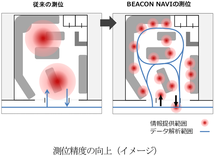 「BEACON NAVI」は、施設に配置したビーコン端末からの情報と屋内地図情報を基に測位補正する技術を用いて、従来の10m超の測位精度に対し、3m程の高精度の測位サービスとフロアを考慮した誘導を可能にします。これにより、施設利用者へのスマートデバイスを通じたナビゲーションサービスや、サービス提供施設へ細やかな位置情報を生かした分析サービス等の提供が可能となります。