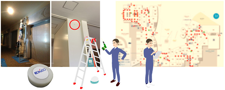 - ビーコンの設置個数が多い大規模商業施設でも、電波特性を把握した設置場所に最適な設置方法でビーコン設置工事を実現