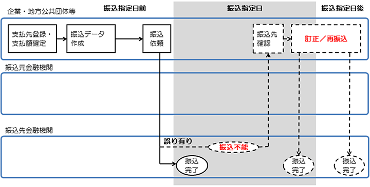 企業・地方公共団体等において社員への給与支払いや取引先への支払いで用いられる給与振込・総合振込は月間2千万件の給与振込や3千万件超の給付金振込等があり、事前に振込データが登録され一括で処理されます。その際、振込データの中に口座番号・口座名の誤りが含まれている場合、振込不能となり振込の訂正あるいは再振込を行う必要が生じます。その結果として振込遅延が発生する可能性がありました。