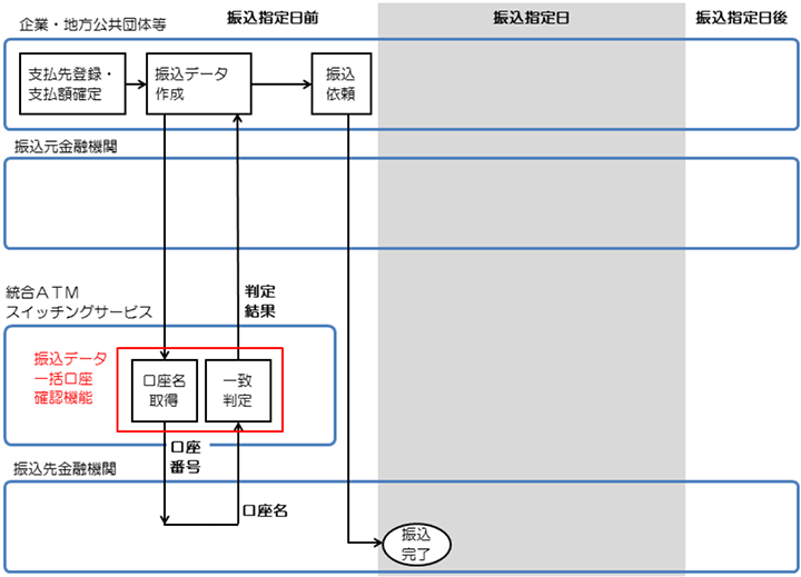 NTTデータは、国内金融機関のCD/ATMを相互接続する統合ATMスイッチングサービス注1を活用し、金融機関向けに一括口確機能のサービスを提供します。一括口確機能は、振込元金融機関より受領した振込データの口座番号を使って、振込先金融機関から該当する口座名を取得します。その後、取得した口座名と振込データの口座名の一致判定を行い、振込元金融機関へ判定結果を最短当日中、遅くとも翌営業日中までに返却します。