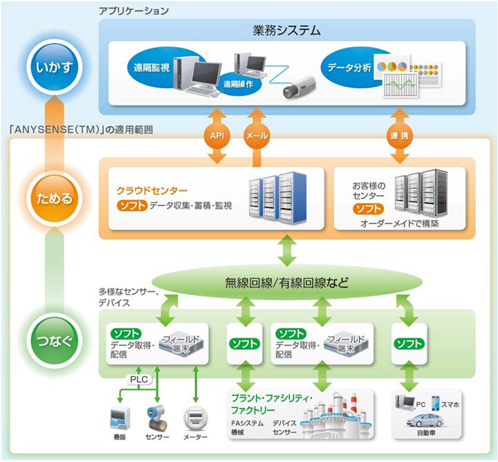「ANYSENSE」はセンサーとセンターを「つなぐ」機能と、センターでデータを「ためる」機能から構成されます。