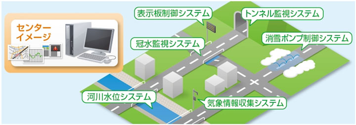 都道府県・市町村等の道路管理、河川管理、防災等で使用するセンサーや機器データの集配信への展開を推進します。