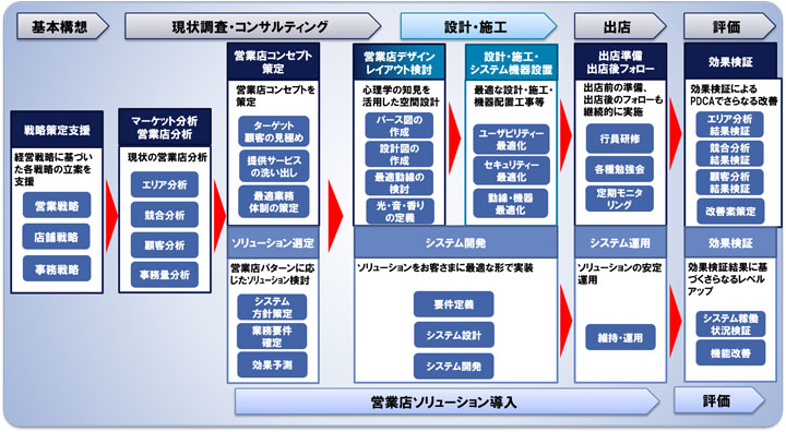 「営業店トータルサービス」では、金融機関の新規営業店構築や既存営業店のリニューアルなどにおいて、戦略立案支援から、マーケット・営業店分析、営業店コンセプト策定、営業店ソリューションの選定と導入(システム開発・運用)、営業店デザイン、設計・施工、出店準備および出店後の効果検証まで、営業店構築・運営を一貫してサポートします。
