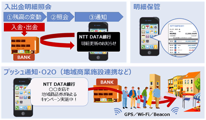 金融機関が本サービスを導入することで、金融機関の顧客はスマートフォンからリアルタイムでの入出金明細確認ができるほか、入出金等残高変動時の自動通知を受けることが可能となります。また、金融機関は顧客の位置情報を活用し、位置連動型プッシュ通知などを行うことが可能となり、地域に密着した金融機関ならではのキャンペーンやお知らせなどを最適なタイミングで配信することが可能となります。