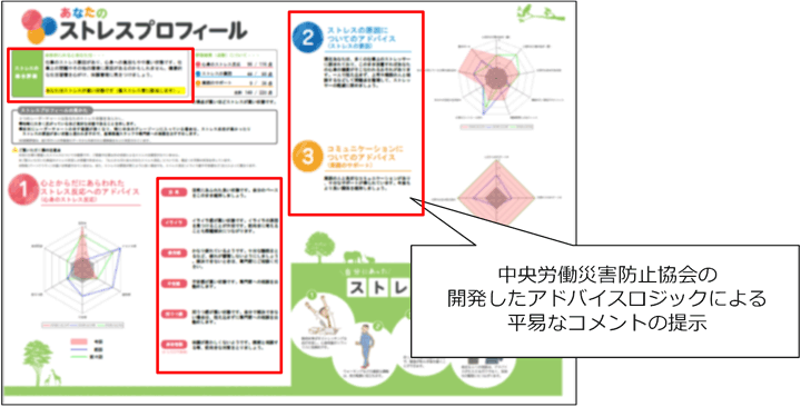 そこで今回は中災防が開発した、専門用語を使わず分かりやすいリポートを提供する「ヘルスアドバイスサービス」のアドバイスロジックによるコメントを選択できるようにしました。これにより産業医等は面接指導等においても、より平易なコメントを用いたアドバイスが可能になり、従業員も分かりやすいフィードバックをもとに生活習慣の改善を行うことができます。