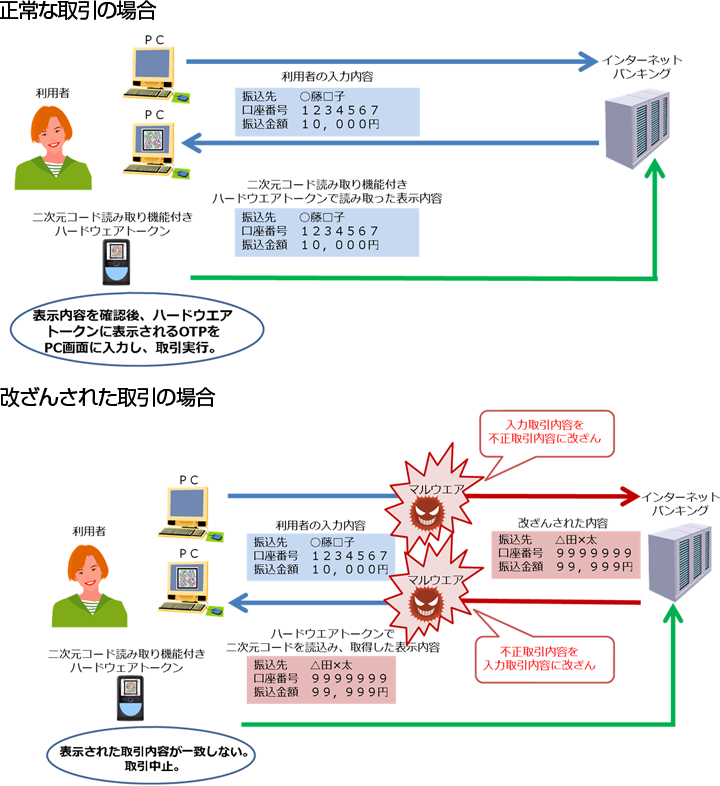 - ハードウエアトークンによって取引内容を目視で確認できるため、マルウエアによる改ざん手段を問わず、検知することが可能です。
