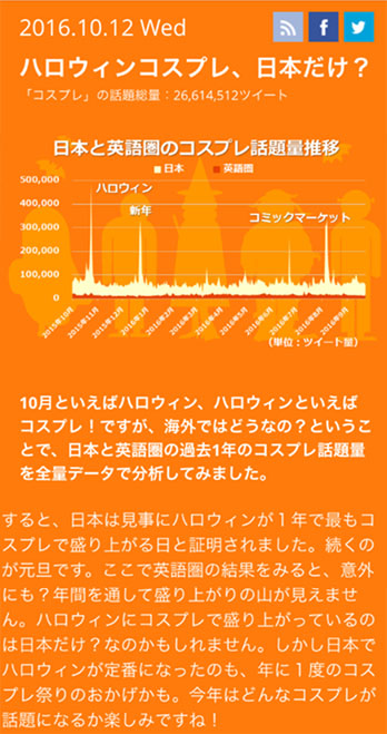 10月は「ハロウィンとコスプレ」がテーマ。初回は、日本と英語圏で、「コスプレ」の話題量のトレンドを比較しました。合計26,614,512ツイートから、日本では、ハロウィンや新年のころにコスプレの話題が盛り上がりを見せる一方で、英語圏ではどのような結果が見られたのか、詳しくは10月17日配信の記事をご覧ください。