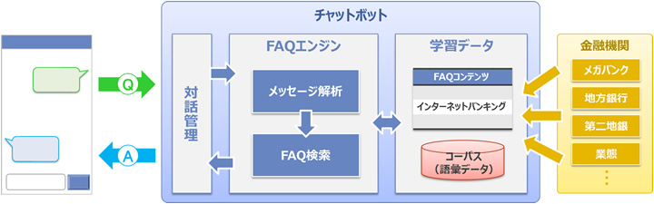 本サービスは、利用者からの問い合わせに対し、対話形式で自動応答するサービスです。AI技術を活用し、利用者の問い合わせの意図を理解した最適な回答を行います。金融機関は全銀システムの稼動時間拡大に向け、喫緊の課題である夜間・休日の顧客サポートに、チャットボットで対応できるようになります。また、本サービスを利用する金融機関全体で学習データ等を共有することができ、大量の学習データを準備する負担を軽減することが可能です。