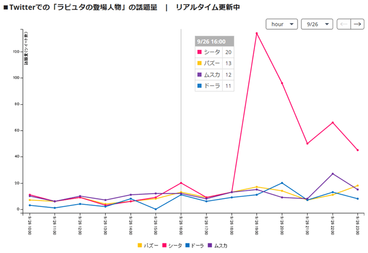 主要4キャラクター「シータ」「パズー」「ドーラ」「ムスカ」の話題量をリアルタイム表示、各キャラクターの話題の盛り上がりをつかむことができます。