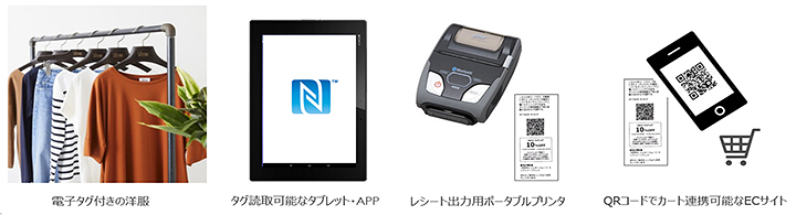 お客さまは設置(あるいは店員によって保持)されたタブレットに表示される仮想Webカートページから商品を投入し、プリンターからQRコードが印刷されたレシートを発行した後、お客さまがスマートフォンやタブレットといった個人のデバイスでQRコードを読み込み、アクセスしたECサイトより簡単に商品を購入できます。