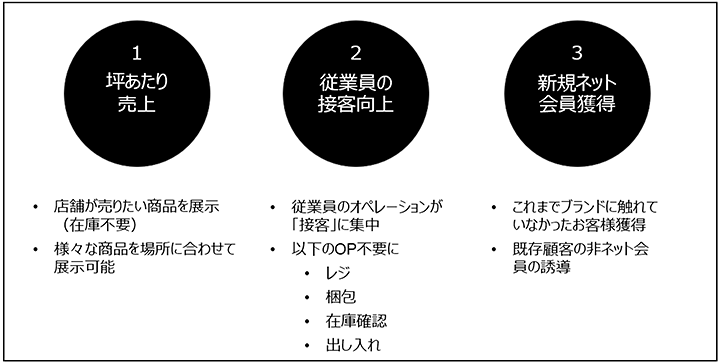 また、お客さまが希望する色やサイズの在庫がなく、お客さまが購入に至らないまま終わってしまうといった販売機会損失をなくす効果も見込めます。