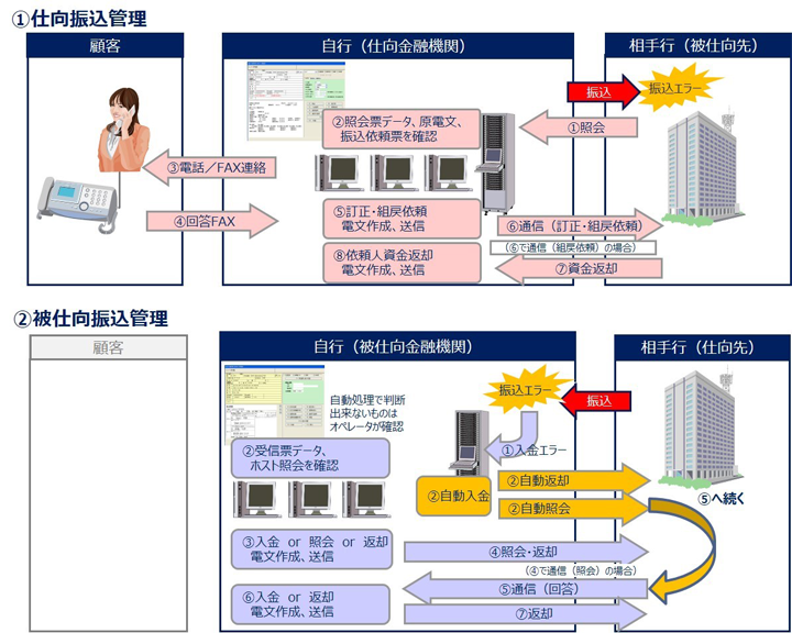北陸銀行と横浜銀行は本システムを利用することで、伝票への記載内容の不備により、自行からの振込が他金融機関でエラーとなる「仕向エラー処理」や、自行・他金融機関からの振込が自行内でエラーとなる「被仕向エラー処理」の事務を効率化すると共に、ペーパーレス化による紙の置き忘れ・紛失などの情報漏洩の防止を実現します。