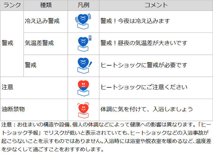 ヒートショック予報は、東京ガスの保有するヒートショックの研究結果や住宅環境に関する知見などをもとに、日本気象協会の保有する生活指数情報の開発技術を用いて冬季における気温の予報から、屋内で生じる冷え込みや温度差の程度を推定し「ヒートショックのリスクの目安」を3ランク5種類の記号で表現した情報です。