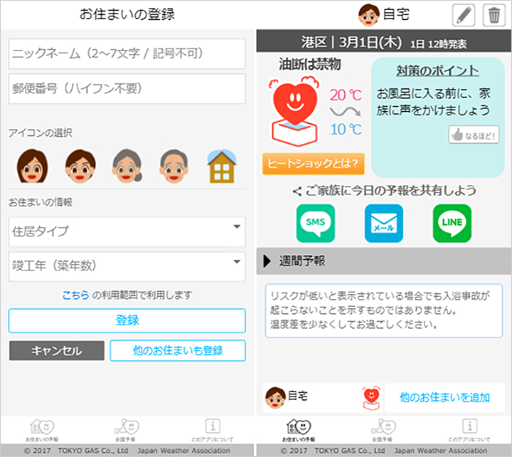 利用者は「myTOKYOGAS」注3にて住宅情報を入力することで、住宅ごとの「ヒートショック予報」の閲覧が可能です。なお、本予報は「myTOKYOGAS」の会員登録がなくても利用可能です。また、2018年3月31日(土)まではトライアル配信のため無償で利用することができます。