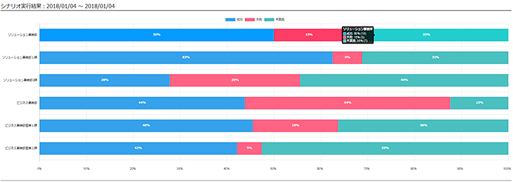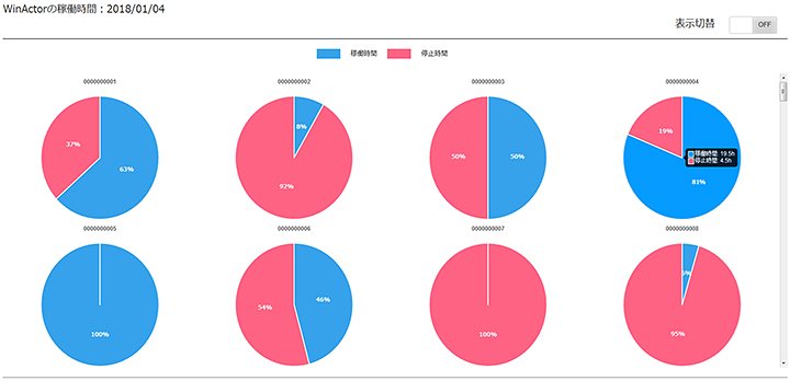業務実行の結果を、グラフを用いてリアルタイムに報告します。業務ごとの実行数やエラーの発生率、WinActorの稼働状況などを集計、表示し、次の自動化対象業務の決定などを事実に基づいて行うことができます。