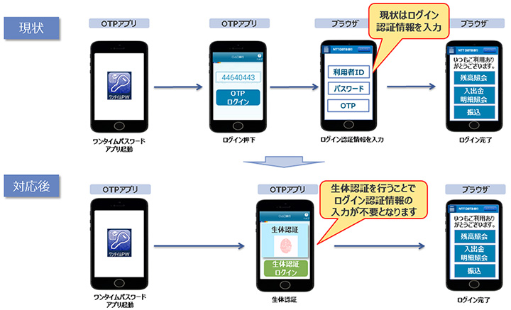 「AnserParaSOL」ではスマートフォン画面のログインにおいて、利用者ID・パスワードによる認証に加え、セキュリティ強化のため、1度限りで無効になる使い捨てパスワードで認証を行うOTP認証を採用しています。このため、利用者がログインするためには利用者ID・パスワード・OTPを入力する必要があり、煩雑さを招いていました。