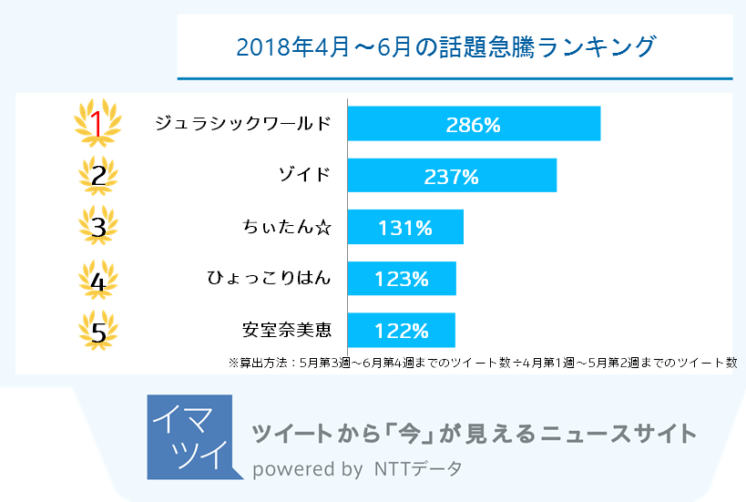 今、最も話題が急騰しているのは、7月にシリーズ最新作が公開された『ジュラシックワールド』!そして、下半期に話題の急騰が予想される『安室奈美恵』の今後にも注目。