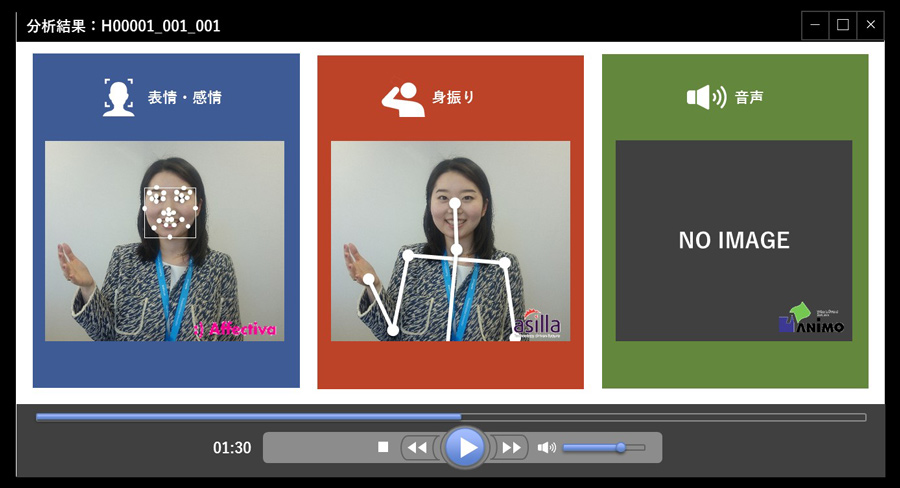 本サービスはさまざまな活用シーンを想定しており、トライアルサービスでは、営業担当者のロールプレイ研修を対象にしています。ロールプレイ研修で営業担当者を撮影し、コミュニケーション要素や印象値を数値化することによって、客観的なフィードバックを提供することができます。2017年度に三井住友海上あいおい生命と実証実験を行い、初期の分析エンジンを構築しました。2018年4月より富国生命、三井住友海上あいおい生命(五十音順)、他2社にトライアルサービスを提供し、引き続き分析エンジンの精度向上を行っています。