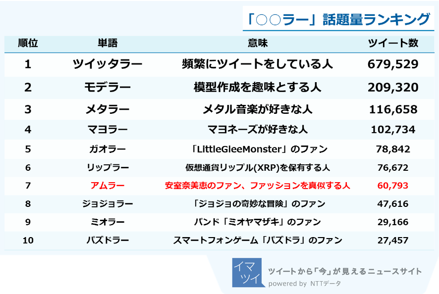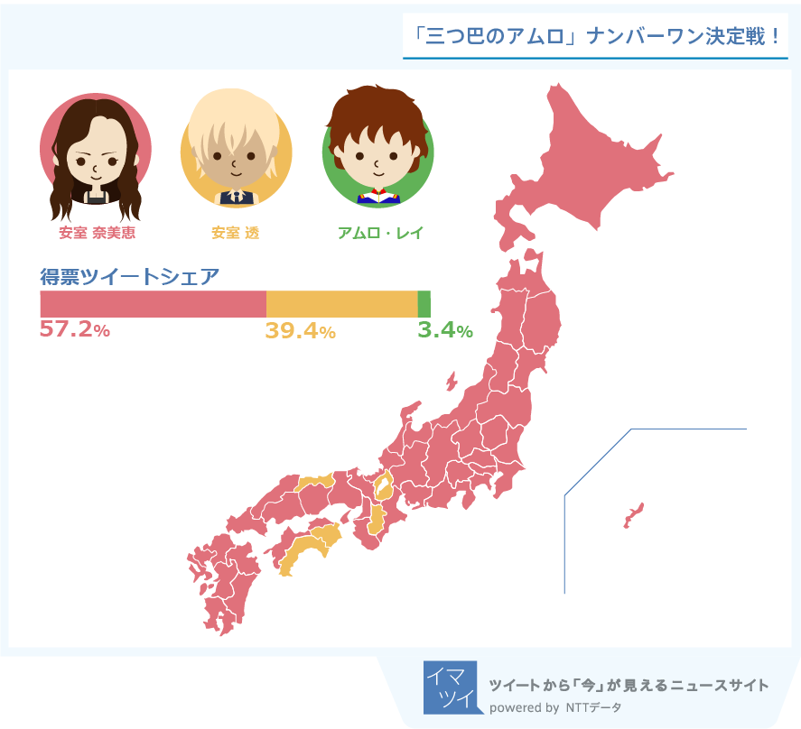 株式会社NTTデータは、イマツイの最新記事で、歌手・安室奈美恵の引退に際してTwitter全量データを元に、"アムロ"に関する話題量を調査。「安室奈美恵」、名探偵コナンの「安室透」、機動戦士ガンダムの「アムロ・レイ」の、"三大アムロ"に関する都道府県別話題量と、「アムラー」から派生し浸透した「○○ラー」という言葉の話題量ランキングを発表。さらに、7月29日放送「イッテQ」では安室奈美恵との共演が大きな話題となったイモトアヤコが、安室奈美恵の大ファンとして認知されるようになった経緯を、これまでのイッテQ放送回の話題量から振り返ります。