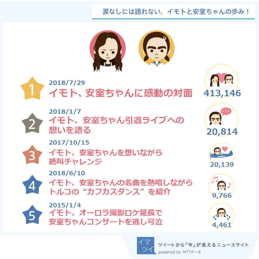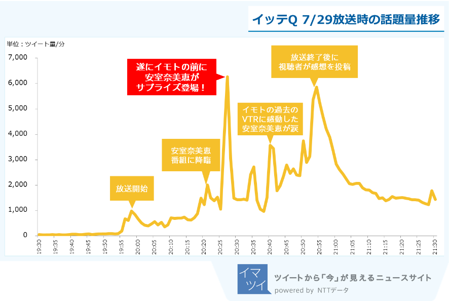 「イッテQ」を通じて、安室奈美恵の大ファンを公言していたイモトアヤコ。これまでの放送で話題になったシーンをランキング化!さらに、安室奈美恵がイッテQにサプライズ出演した7月29日放送時の話題量を5分単位で分析。