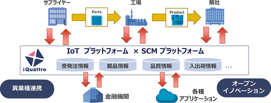 「iQuattro」とは、部門間、拠点間、企業間などに散在するデータと先進デジタル技術を組み合わせて、新たな情報活用価値を創出するためのクラウド型のプラットフォームサービスです。これを利用することで、企業はサプライチェーンや業務プロセスのリアルタイムな可視化や情報共有を通じて、各種業務オペレーションの最適化や生産活動の高度化、コスト削減が期待できます。