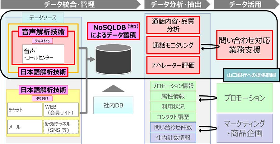 今回、本ソリューションの音声認識技術や、これまでの日本語解析技術を活用したコールセンター業務の応対品質向上、業務効率化、それに伴うお客さま満足度向上などの実績が山口銀行に評価され、採用されることになりました。