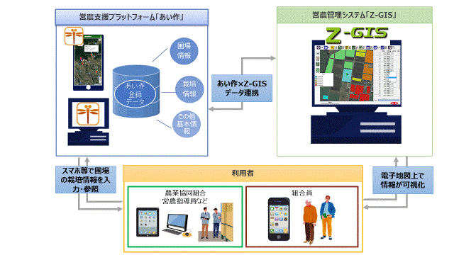 今回のサービス連携では、「あい作」で管理している地域全体の農家の圃場情報や農作物の栽培情報を「Z-GIS」と連携させ、電子地図上での可視化を実現します。JA全農が「Z-GIS」を他社サービスと連携することは、「あい作」が初めての取り組みとなります。