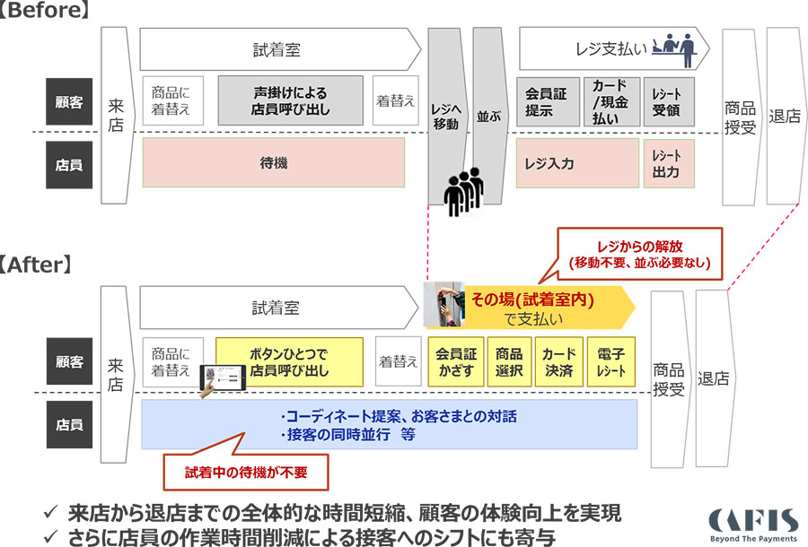 - 試着室内で決済が完了することにより、レジへの移動やレジ待ちが不要となる