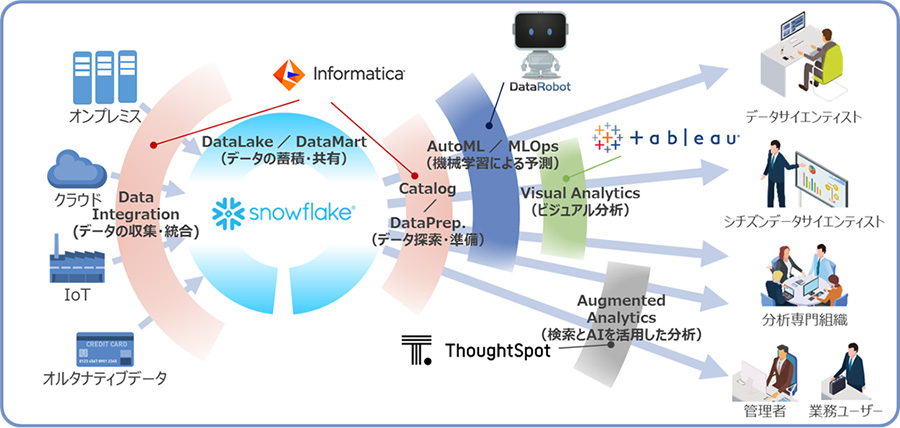 図1:「Snowflake」および各パートナーのコア技術とともに生み出す「AI・データの民主化」イメージ