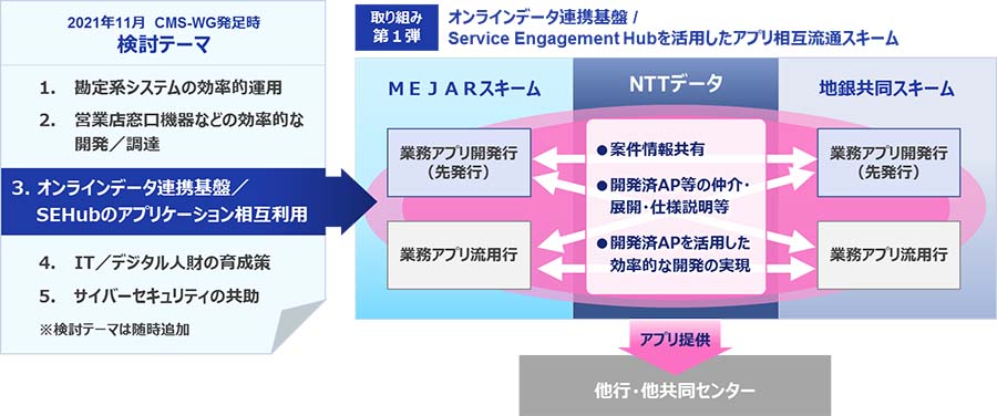 株式会社NTTデータ(代表取締役社長 本間 洋、以下、NTTデータ)は、「地銀共同センター・MEJARシステム・ワーキンググループ(以下、CMS-WG注1)」の取り組みの第1弾として、オンラインデータ連携基盤注2/Service Engagement Hub™注3を活用したアプリ相互流通スキーム(以下、相互流通スキーム)を立ち上げました。CMS-WG はNTTデータ地銀共同センター(以下、地銀共同センター)の参加行13行注4、およびMEJARを共同利用している全5行注5が立ち上げ、NTTデータもメンバーとして主にテクノロジー面の支援で参画するワーキンググループです。