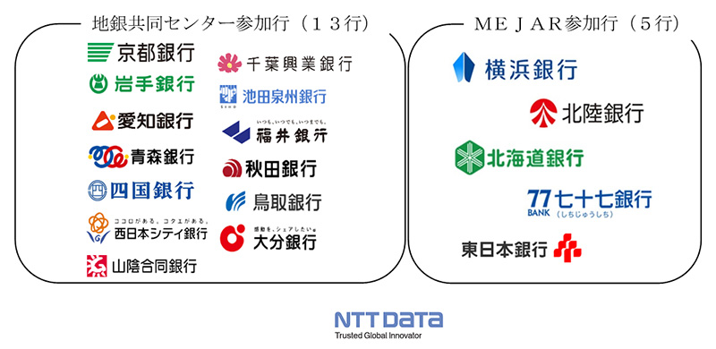 京都銀行、千葉興業銀行、岩手銀行、池田泉州銀行、愛知銀行、福井銀行、青森銀行、秋田銀行、四国銀行、鳥取銀行、西日本シティ銀行、大分銀行、山陰合同銀行 - 注5「MEJAR」は、NTTデータが構築・銀行が主体で運営する、地方銀行・第二地方銀行向け基幹系共同センターです。