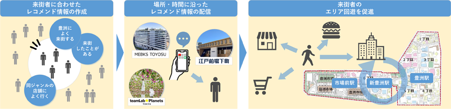 実証実験では、豊洲エリアの都市活動から得られるデータの可視化・分析を行う「バーチャル豊洲ビューアー注3」の構成機能である「BizXaaS MaP® 人流分析注4」により豊洲来街者の行動属性・志向を分析し、その分析結果をもとに構築したペルソナ像に対して場所・時間に沿ったレコメンド情報をプッシュ通知します。プッシュ通知の仕組みには株式会社unerryの「Beacon Bank AD」を活用します。豊洲来街者に対して好みに合った情報を届け、来街者数の増加や快適なエリア回遊などの実現を目指します。