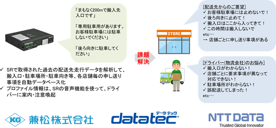 そこでNTTデータは、兼松、データ・テックとともに、ドライバーと配送先双方の課題を解決するため、SRから取得した過去の走行データを活用して、店舗ごとのプロファイル情報を自動生成し、配送先に近づいた際にSRの音声案内でドライバーに注意喚起する「みせナビ™」を開発しました。