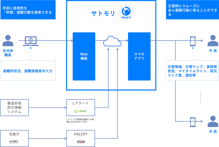 サトモリは、自治体職員、都道府県防災システム(EYE-BOUSAI®注2等)/Lアラート注3およびHALEX®注4等から発信される災害情報を、市民一人ひとりにパーソナライズして、プッシュ型で効率的に届けるサービスです。NTTデータグループが有するEYE-BOUSAI、HALEX等のアセットを活用することで、これまでの提供実績で培ったノウハウをもとに、自治体向けの各種防災関連ソリューションとの連携も目指します。